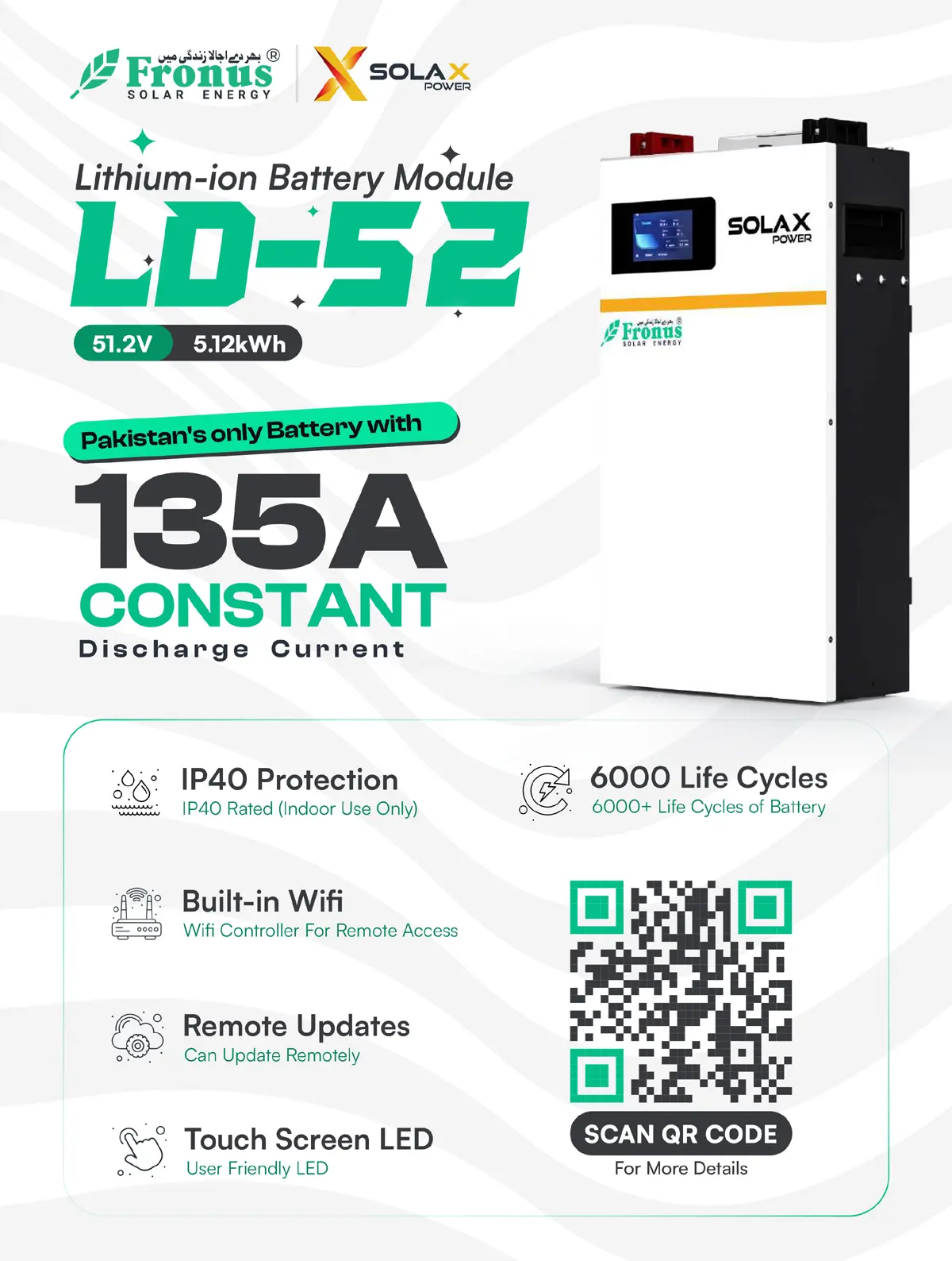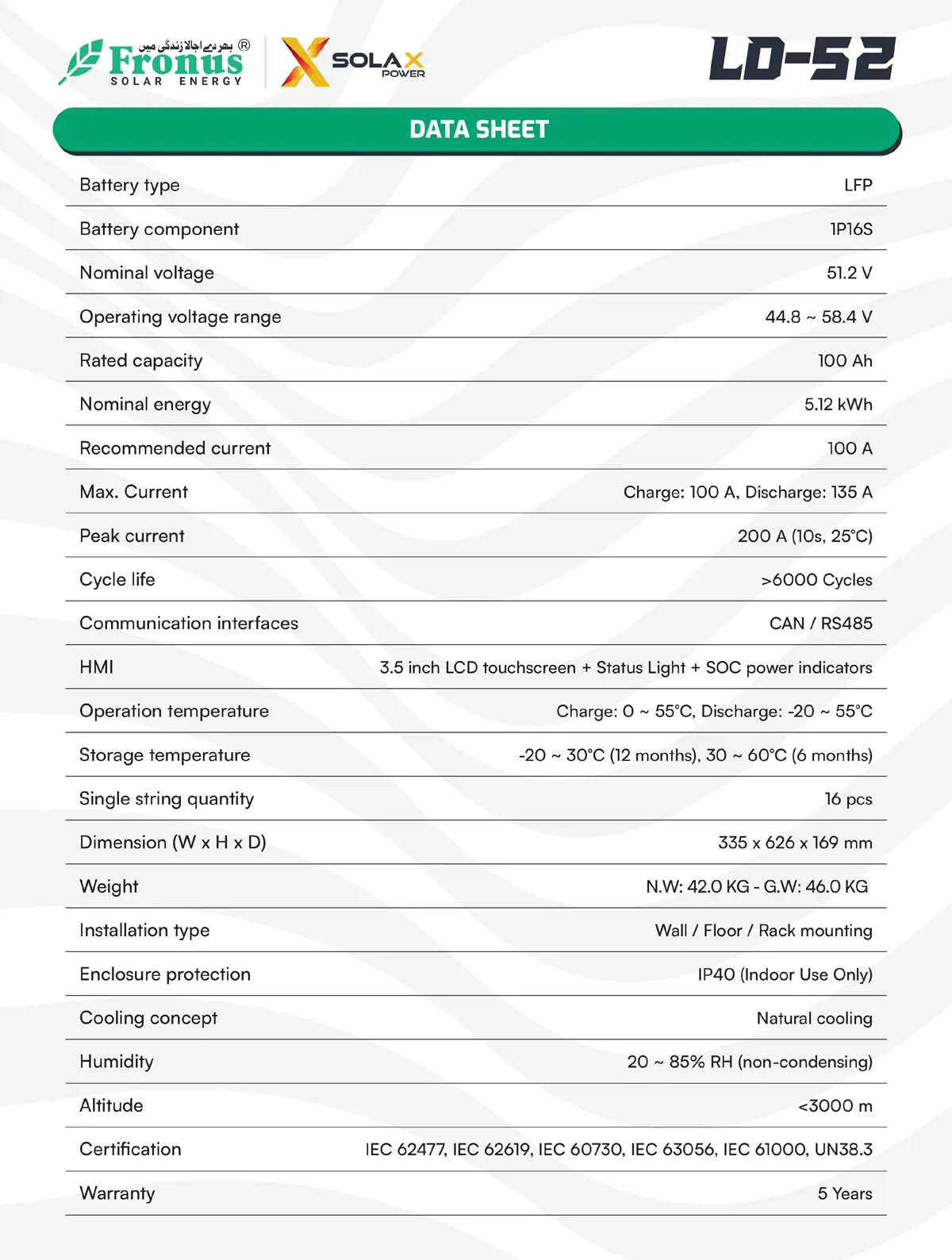 The Solax Power 48V 100A 5.12kWh LD52 Ultra Battery Bank is a high-performance lithium energy storage solution designed for residential and commercial solar systems. Built with advanced LiFePO4 technology, it ensures long lifespan, high efficiency, and superior safety. Its modular design allows easy expansion, enabling users to scale their energy storage as needed. This battery bank provides reliable backup power and seamless energy management, making it an ideal choice for modern solar installations.
